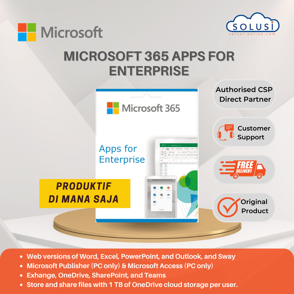 Dengan paket berlangganan Microsoft 365 Apps for Enterprise Anda mendapatkan instalasi aplikasi Office lengkap: Word, Excel, PowerPoint, OneNote, Outlook, Publisher, dan Access (Publisher dan Access hanya tersedia di PC).